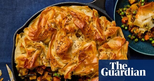 Los karipap son un bocadillo callejero popular que tradicionalmente se rellena con patatas al curry y, a veces, sardinas o carne. Esta versión de pastel tiene el mismo relleno reconfortante, pero es más sencilla y rápida. Para hacerlo vegano, sustituye la mantequilla por aceite vegetal y comprueba que la filo también es apta para veganos.
